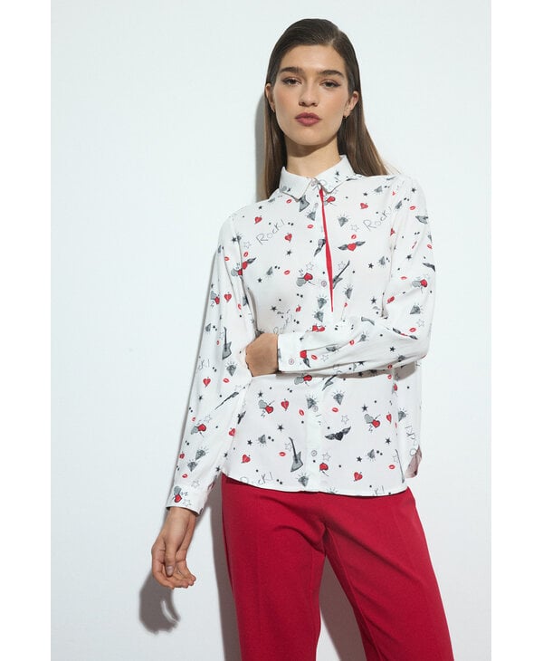 Blouse imprimée rouge et gris sur fond blanc cassé.