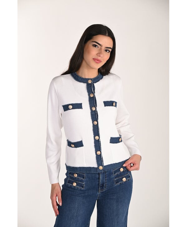 Cardigan blanc et bleu jeans.
