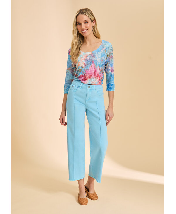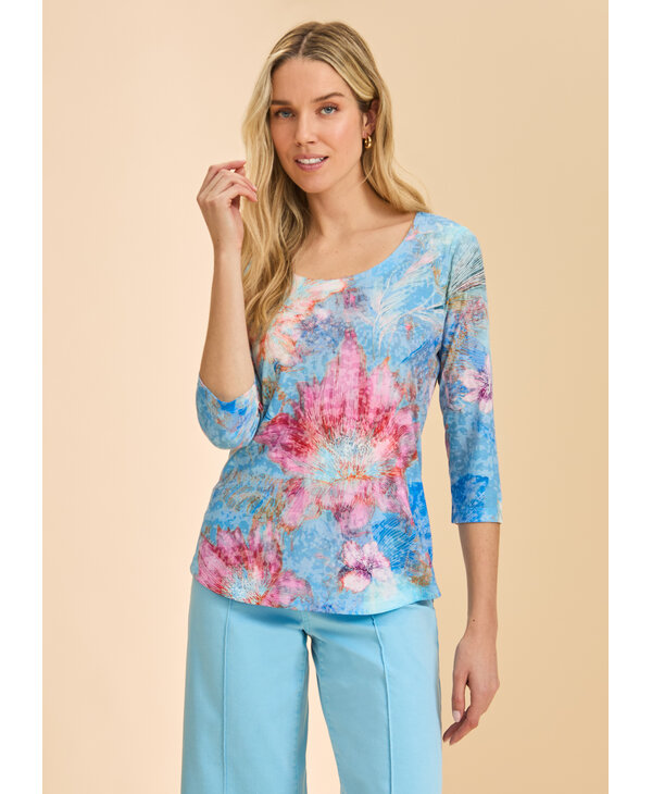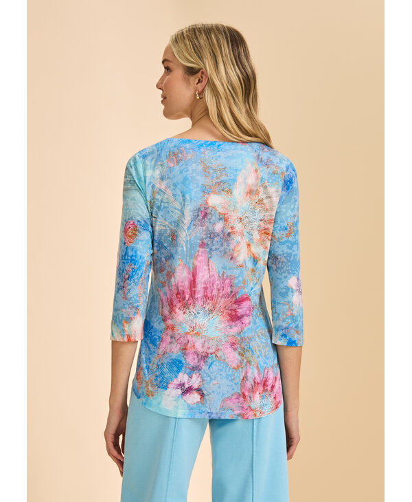 Chandail imprimé tons de rose et bleu.