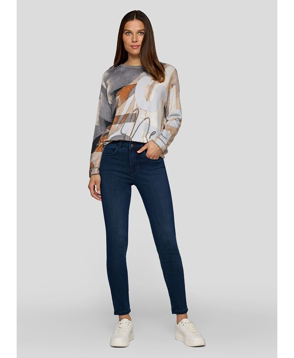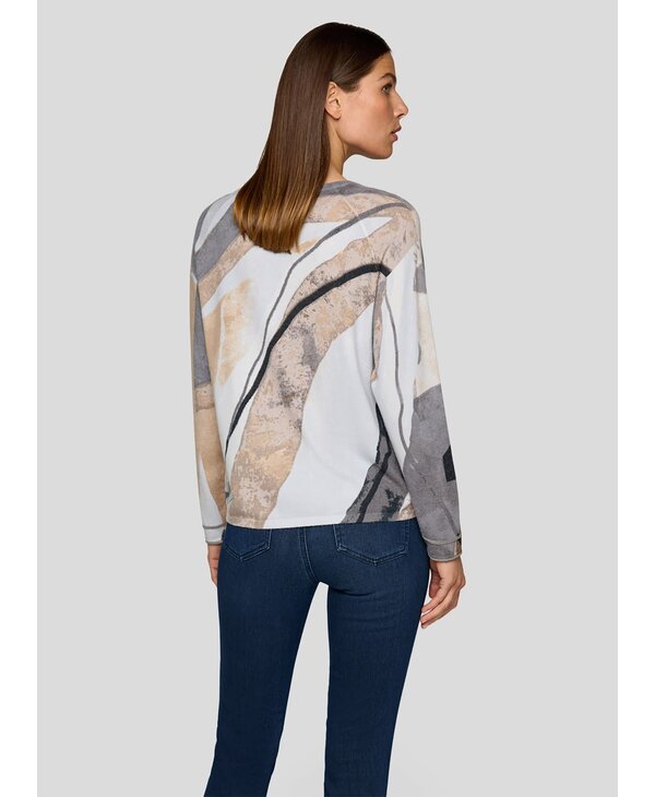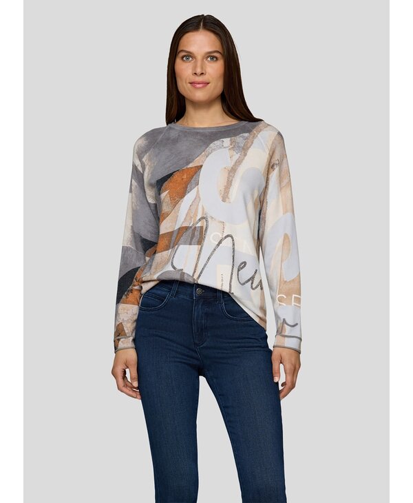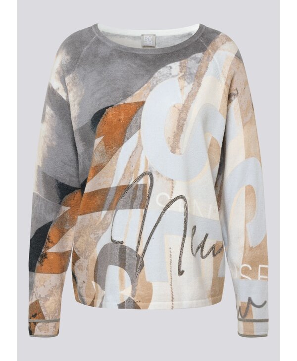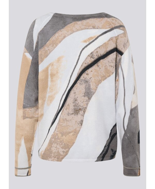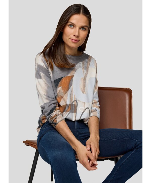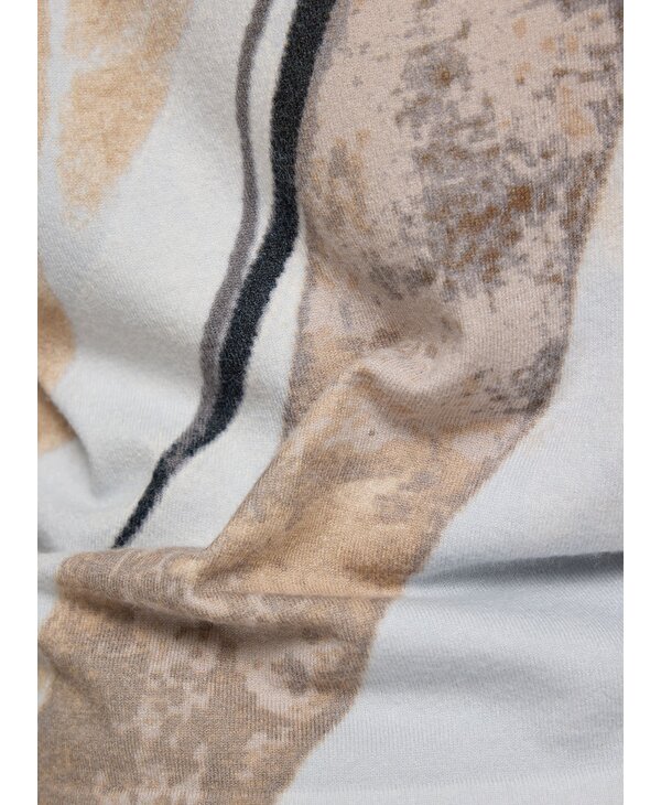 Chandail de tricot fin, tons de gris, beige, cognac.