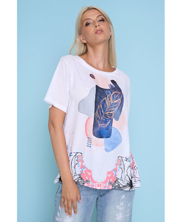 T-Shirt blanc imprimé bleu et rose.