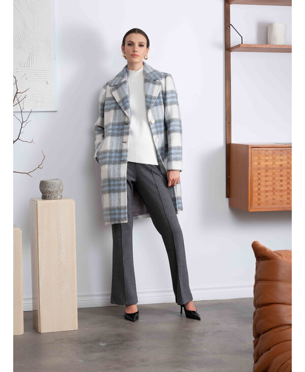 Manteau à carreaux bleu, ivoire et gris.