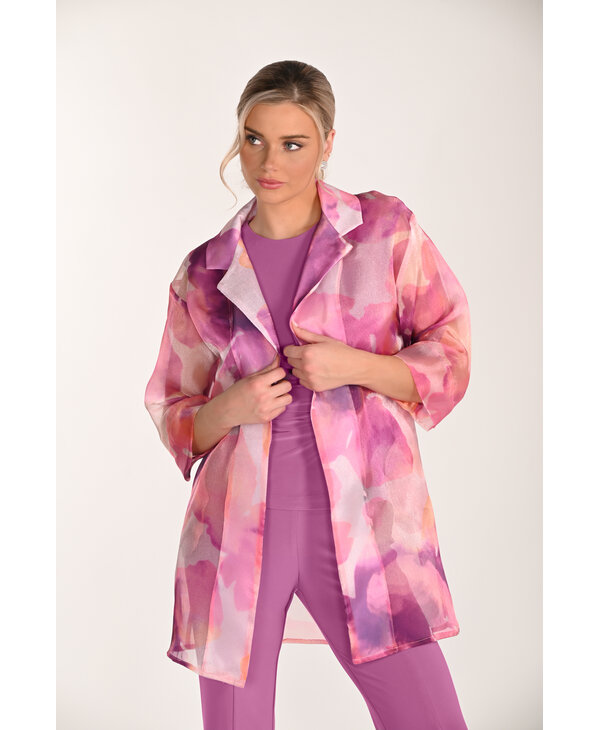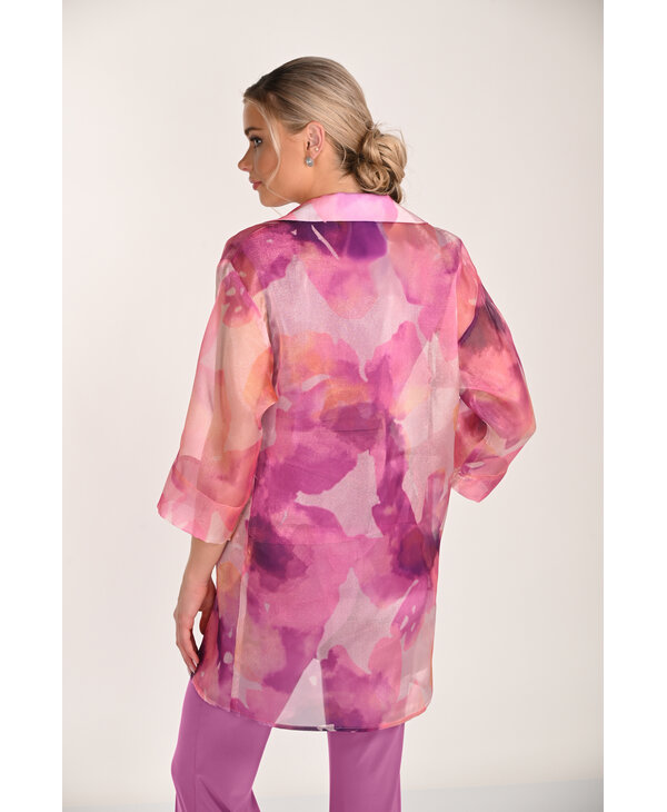 Redingote imprimée tons de rose et corail.