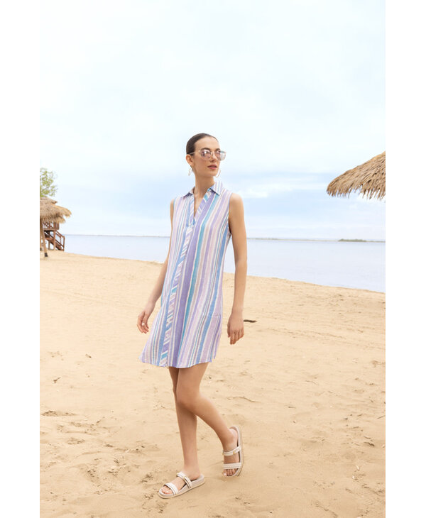 Robe à rayures multi tons de bleu, mauve.