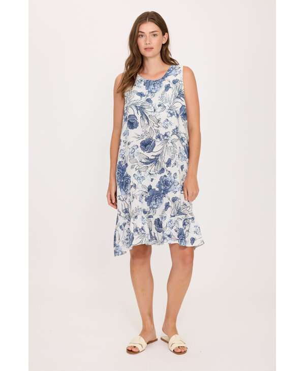 Robe imprimée tons de bleu sur fond blanc.