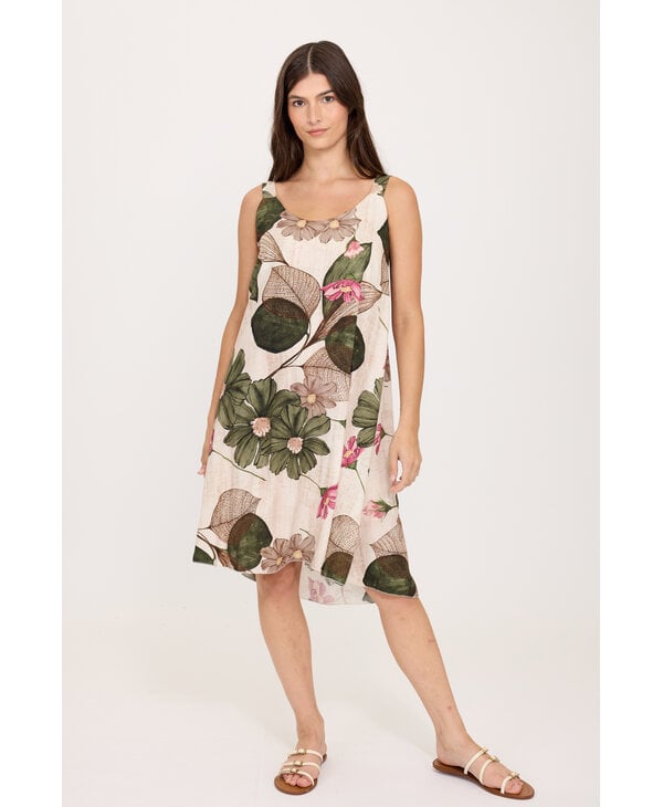 Robe imprimée tons de vert et rose sur fond crème.