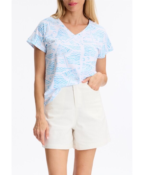 T-Shirt imprimé turquoise sur fond blanc.