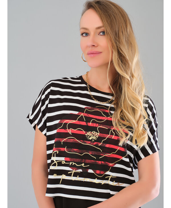 T-Shirt à rayures noir et blanc, rouge.