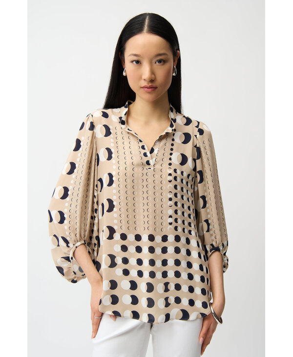 Blouse tons de beige, marine et blanc.